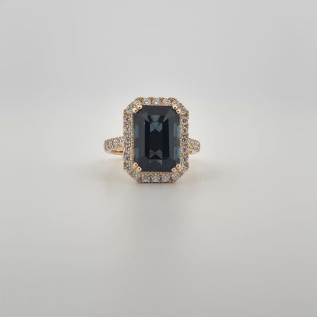 Statement dress ring. 9ct yellow gold ring with rich octagonal cut London blue topaz set in micro claw diamond halo. Finger size: N.